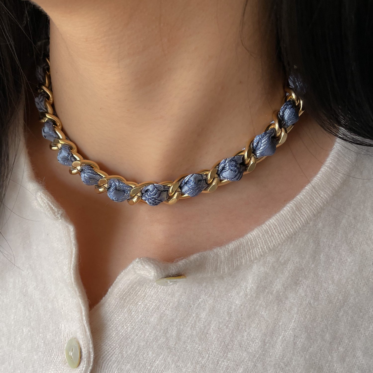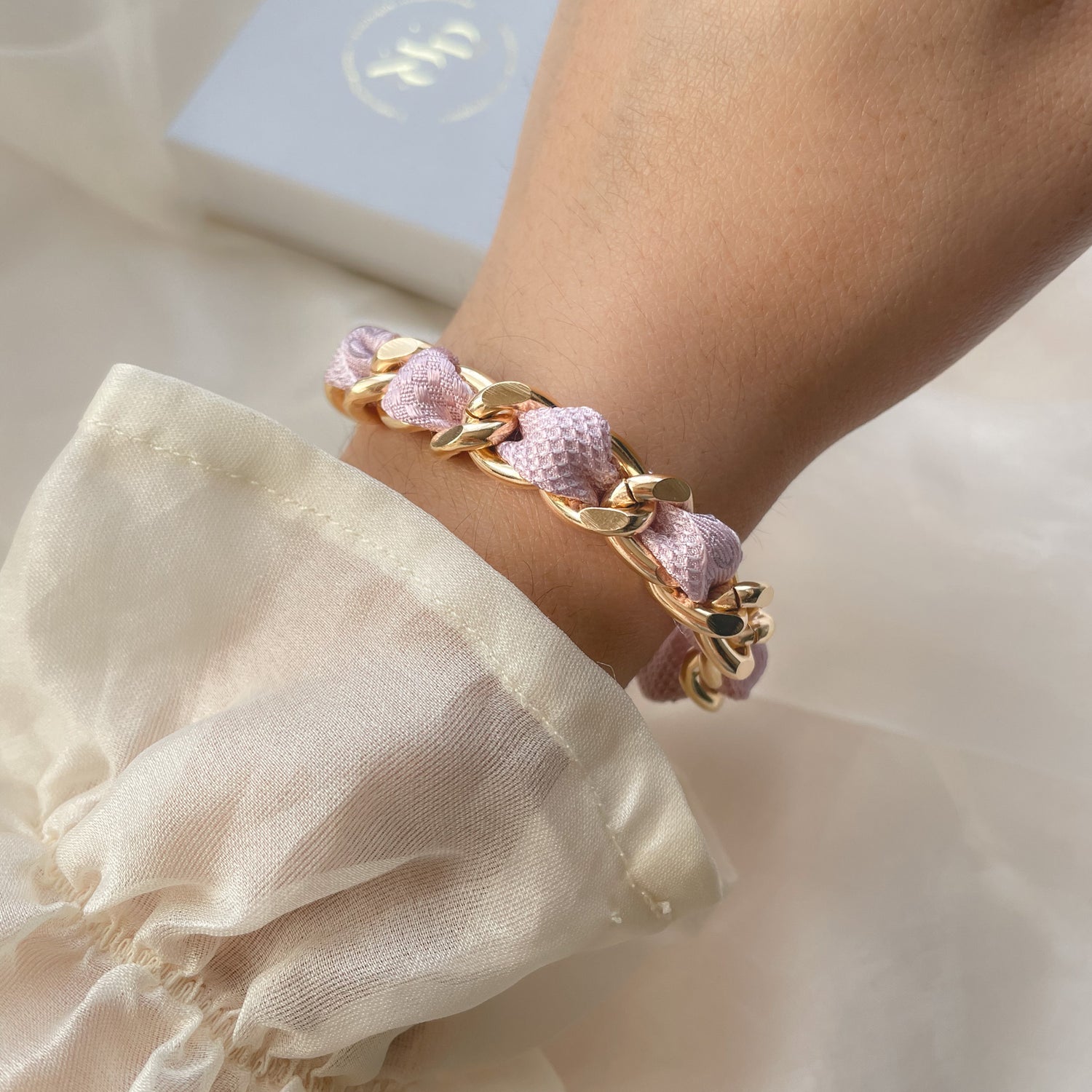 Une maille odacieuse dorée à l'or fin entrelacée par la délicatesse d'un ruban de soie.