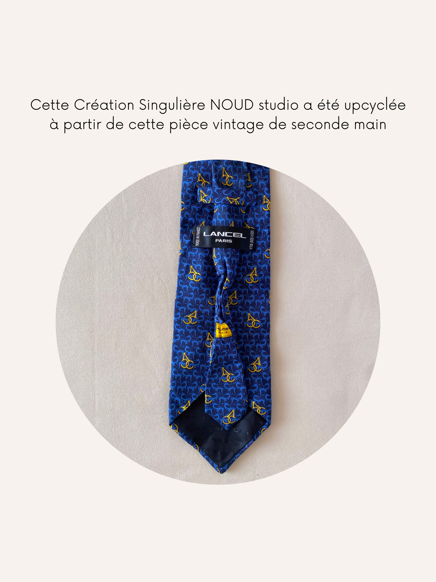 Pour fabriquer cette Création Singulière Upcyclée, nous avons retravaillé une authentique cravate vintage issue de la seconde main, datant des années 90, made in France.